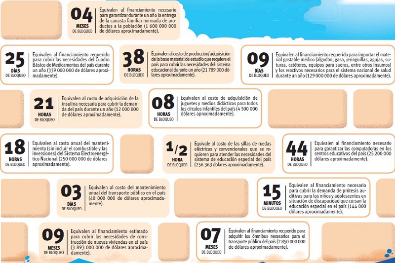 8 horas de bloqueo. Equivalen al costo de adquisición de juguetes y medios didácticos para todos los círculos infantiles del país (4 500 000 dólares aproximadamente).