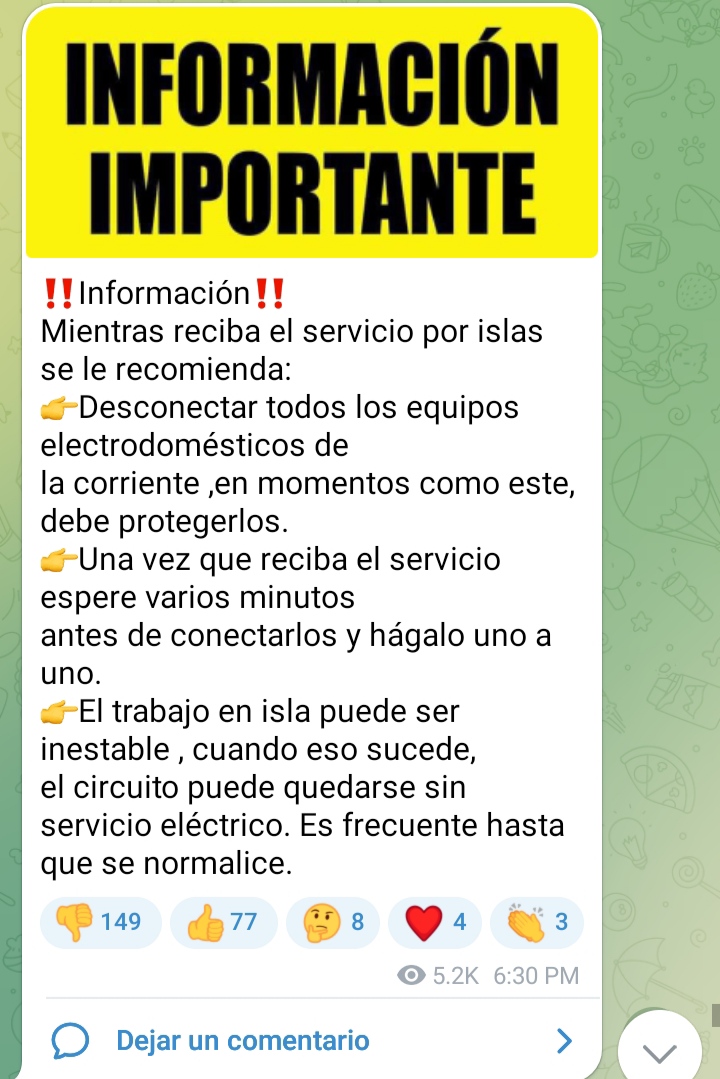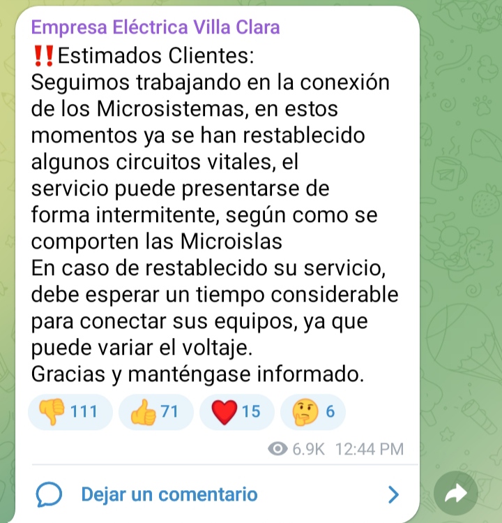 A esta hora, 12:40 p. m. el microsistema eléctrico en Villa Clara comienza a consolidarse, pero sigue débil y por ello solo tienen electricidad, con intermitencias, un número reducido de circuitos de Placetas, Manicaragua y Santa Clara.